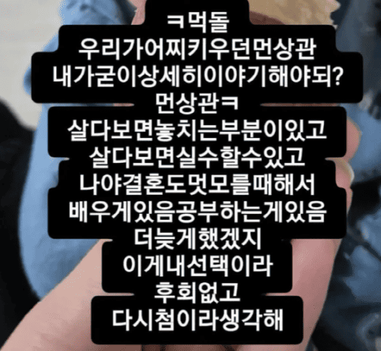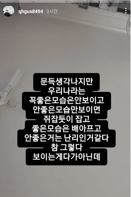 본능 아내 김보현 씨는 12일 자신의 계정에 "문득 생각나지만 우리나라는 꼭 좋은 모습은 안 보이고 안 좋은 모습만 보이면 쥐 잡듯이 잡고 좋은 모습은 배 아프고 안좋은 거는 난리인 거 같다. 참 그렇다. 보이는 게 다가 아닌데"라고 적었다.